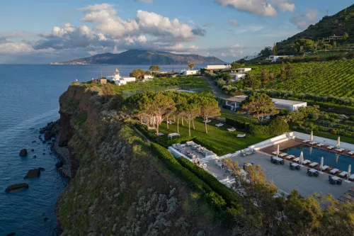 Nestled atop a cliff overlooking the islands of Panarea and Stromboli, Capofaro Resort is a spectacular wine estate in the Aeolian Islands, a UNESCO World Heritage Site in Sicily.